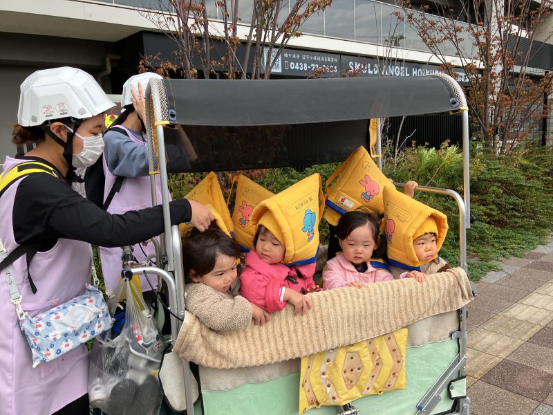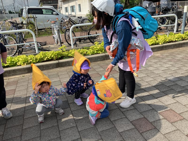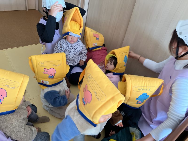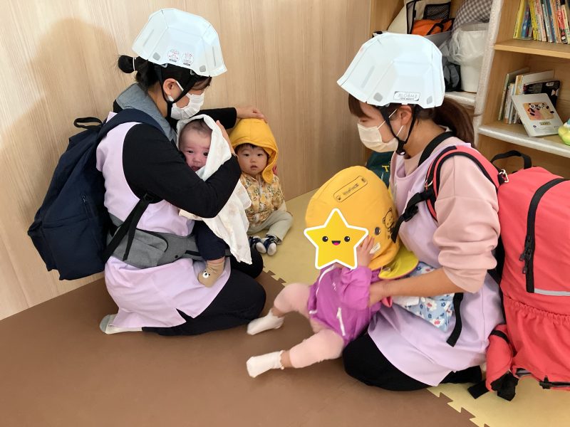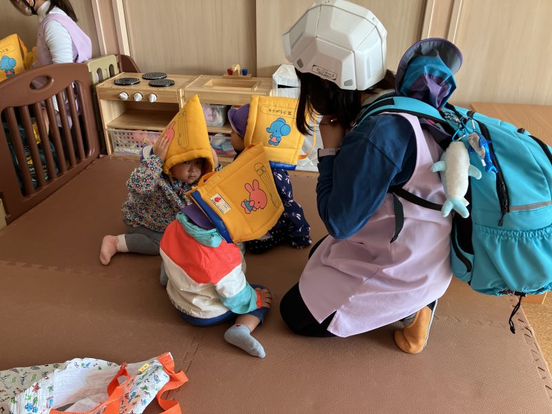第一避難所へ到着し、サイレンを聞いてすぐに先生の近くに集まれた事・防災頭巾を嫌がらずにかぶれた事をたくさん褒めてもらいましたよ♡