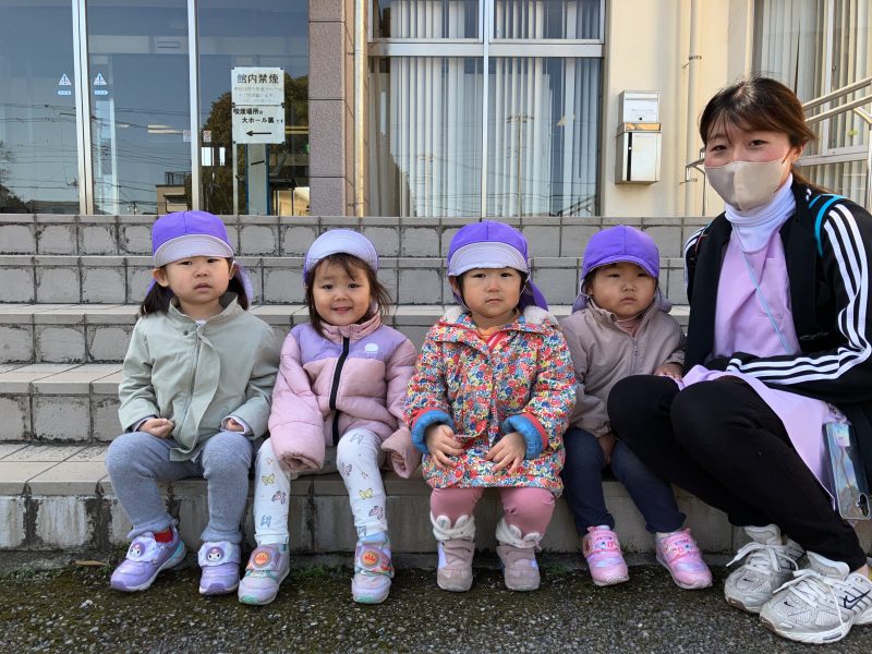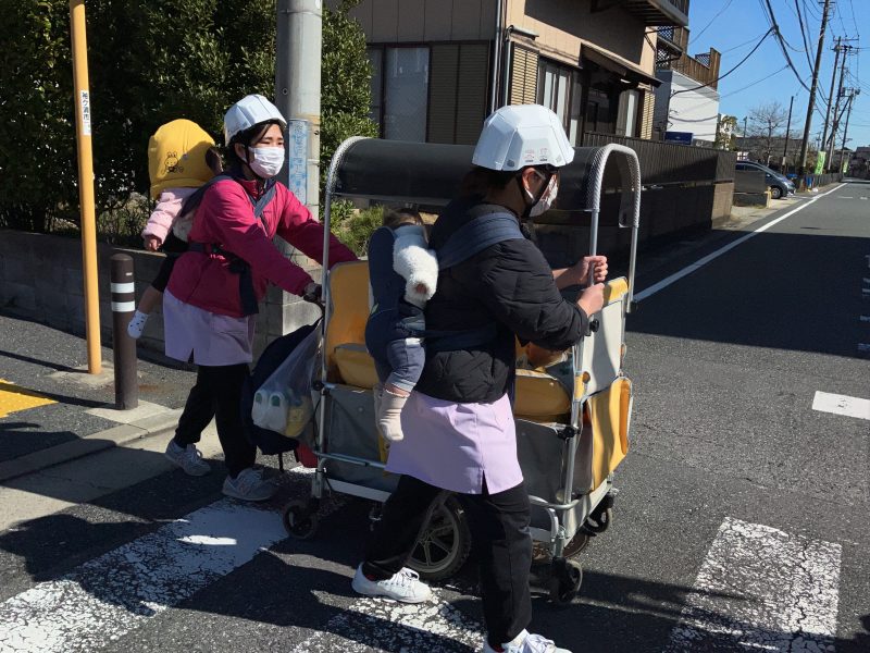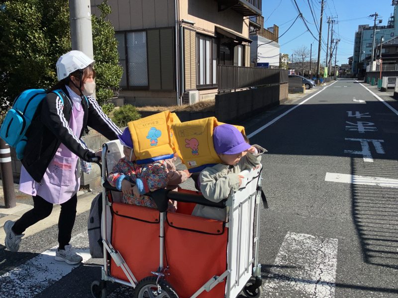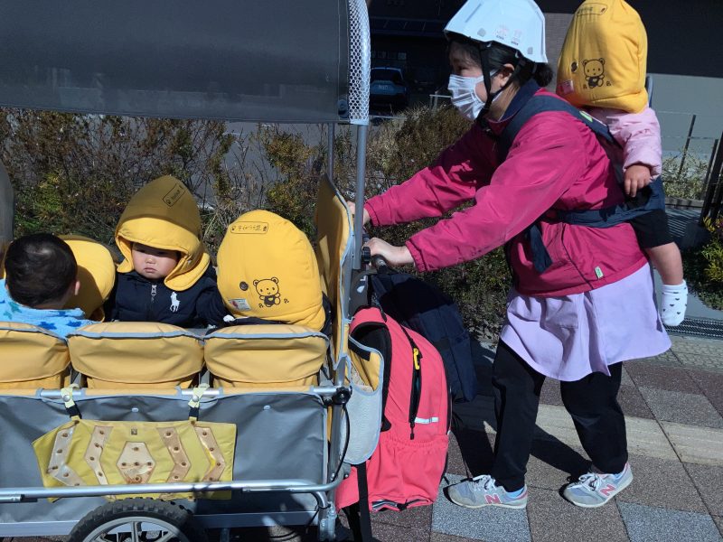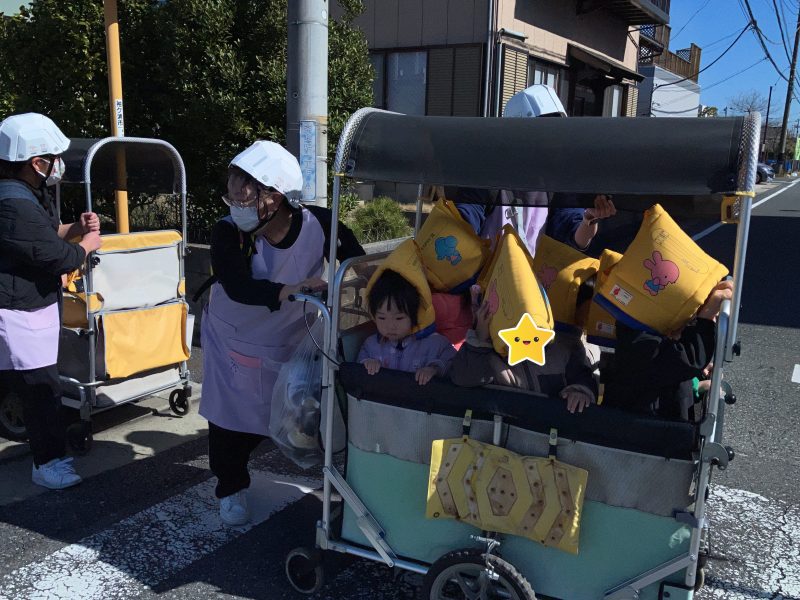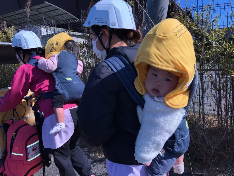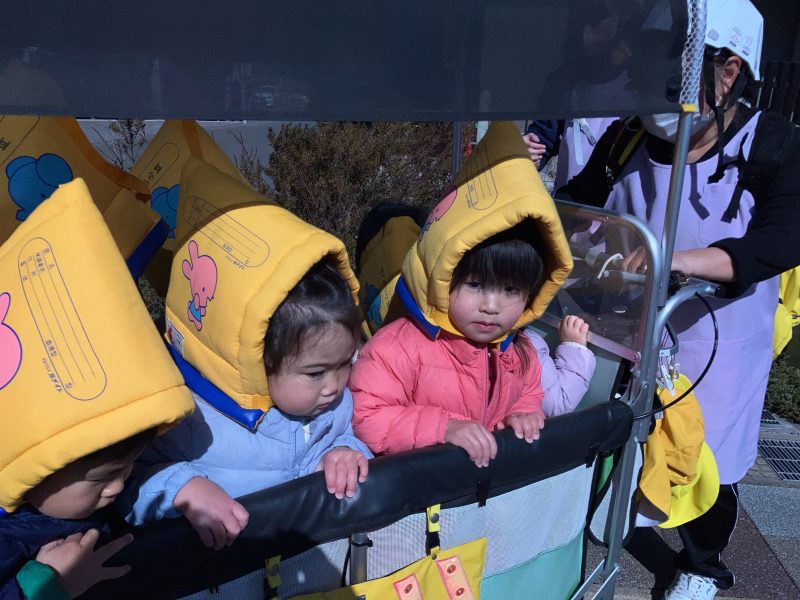 子どもたちはサイレンの音に少し驚いていましたが、避難車に乗り落ち着いています。